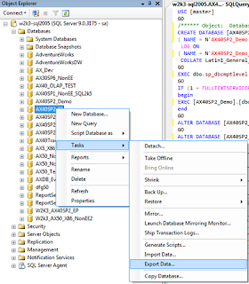 ![]() Select Script to New Query Window and click Finish to generate the script. ![]() Click Close after the script creation is completed. The script will be open in a new query window. Now we need to change name of the database. Press CTRL+H to open Replace window and type original database name into Find what text box and new database name into Replace with text box. Then click Replace All to use new database name through the whole script. ![]() You may close the Find and Replace window now and press F5 to execute the script. Ignore any warnings regarding maximum key length. When the script finishes we have a new database with required collation. We need to transfer the data now. This can be done using Import and Export wizard. Right-click the original database and select Tasks -> Export data from the context menu to start the wizard. ![]() Original database should be selected as data source by default, however you can change it if required. ![]() Select destination database where the data will be copied. ![]() Leave Copy data from one or more tables or views checked and click Next. ![]() It might take several minutes as a new SSIS (SQL Server Integration Services) package is being generated. After the package is created Save and Execute Package window is open. You can save the created package here. If you don't want to save the package, or after you have configured all options to save the package, click Finish to execute the package. After the package execution completes, we just need to configure new database to be used by AOS. Источник: http://mbsturk.blogspot.com/2010/11/...-database.html