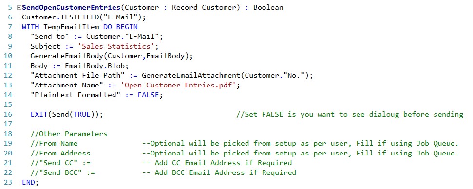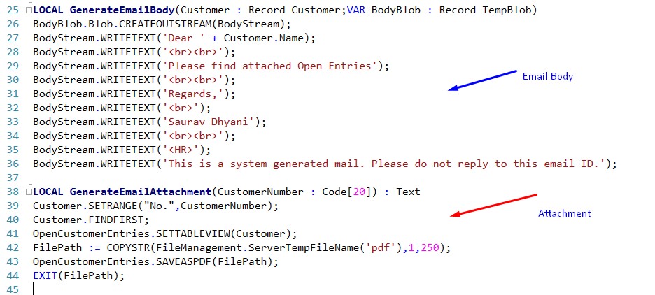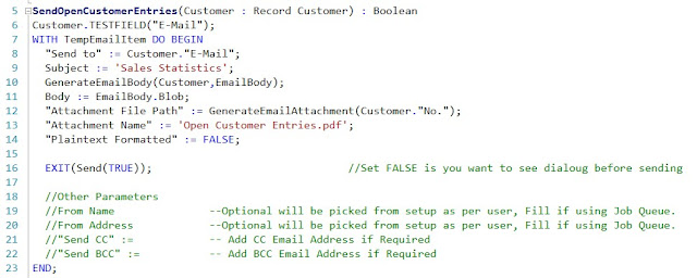 The only feature that I would request to add in this pattern is a possibility to add multiple attachments in an E-mail Item. Any email that you want to send with max. 1 attachment can be send using this pattern. So let's see how to use this pattern in code. Case - My Customer requested to customize NAV for the possibility of sending Report Open Customer Entries using an action on customer page. Let's Create a Codeunit to send email using the Pattern discussed above - 1. Create a Function which accepts Customer record as a parameter. This function check that Email Exist on Customer or not and then generates the record in Email Item. 2. Create Two supported functions which be called from above function. These functions create Email Body and Email Attachment. 3. Let's Now add action in Customer List / Card which calls this custom codeunit function. Now Let's Demo the code - If all setup is correct then the system will generate an email as shown below. Hope it helps. Let me know if it makes sense there are so many additional features in this pattern that I would like to explain if this article helps my readers. Waiting for your reply. You can download the codeunit from OneDrive. File Name- Microsoft Dynamics NAV 2017 - #SauravNAV_Email_Pattern_V1.0 Let me know your views. Regards, Saurav Dhyani saurav-nav.blogspot.in Источник: http://saurav-nav.blogspot.com/2017/...mail-from.html