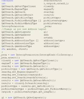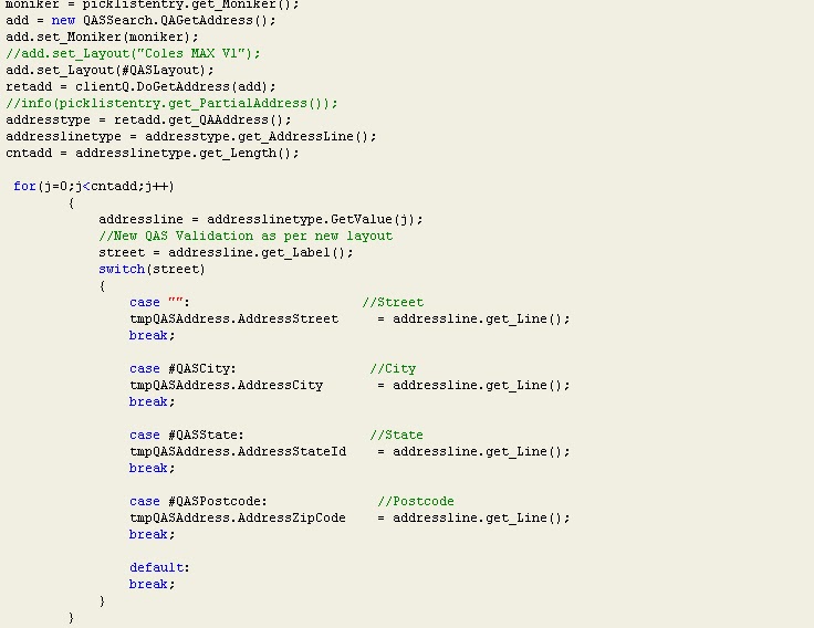 ============== Introduction QAS is a third party address verification service which gets the full address from a given postcode and street. You can find more details in their website http://www.qas.co.uk/products/captur...s-data/pro.htm We had to do integration for Australian Post Codes and Street Addresses. So, we were given the web service by QAS which we needed to plug in to AX Integration with Dynamics AX a. Consume the QAS Web Service by going through Tools > Development Tools > Application Integration Framework > Add Service Reference b. Once the Service Reference is added, write a class to instantiate the proxy and pass the zip code and street name c. Here is a sample code snippet which does the call to QAS and retreives the full address We are calling this class from different forms like Customers, Sales Orders, CRM wherever we need to validate address with QAS Источник: http://daxdilip.blogspot.com/2010/12...h-qas-for.html